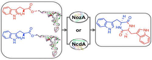Abstract: Diketopiperazine natural products are structurally diverse and offer many biological activities. Cyclodipeptide synthases (CDPSs) were recently unveiled as a novel enzyme family that employs aminoacyl-tRNAs as substrates for 2,5-diketopiperazine assembly. Here, the Nocardiopsis sp. CMB-M0232 genome is predicted to encode two CDPSs, NozA and NcdA. Metabolite profiles from E. coli expressing these genes and assays with purified recombinant enzymes revealed that NozA and NcdA catalyze cyclo(l-Trp-l-Trp) (1) biosynthesis from tryptophanyl-tRNA and do not accept other aromatic aminoacyl-tRNA substrates. Fidelity is uncommon among characterized CDPSs, making NozA and NcdA important CDPS family additions. Further, 1 was previously supported as a biosynthetic precursor of the nocardioazines; the current study suggests that Nocardiopsis sp. may derive this precursor from both NozA and NcdA. This study offers a rare example of a single bacterium encoding multiple phylogenetically distinct enzymes that yield the same secondary metabolite and provides tools for chemoenzymatic syntheses of indole alkaloid diketopiperazines.