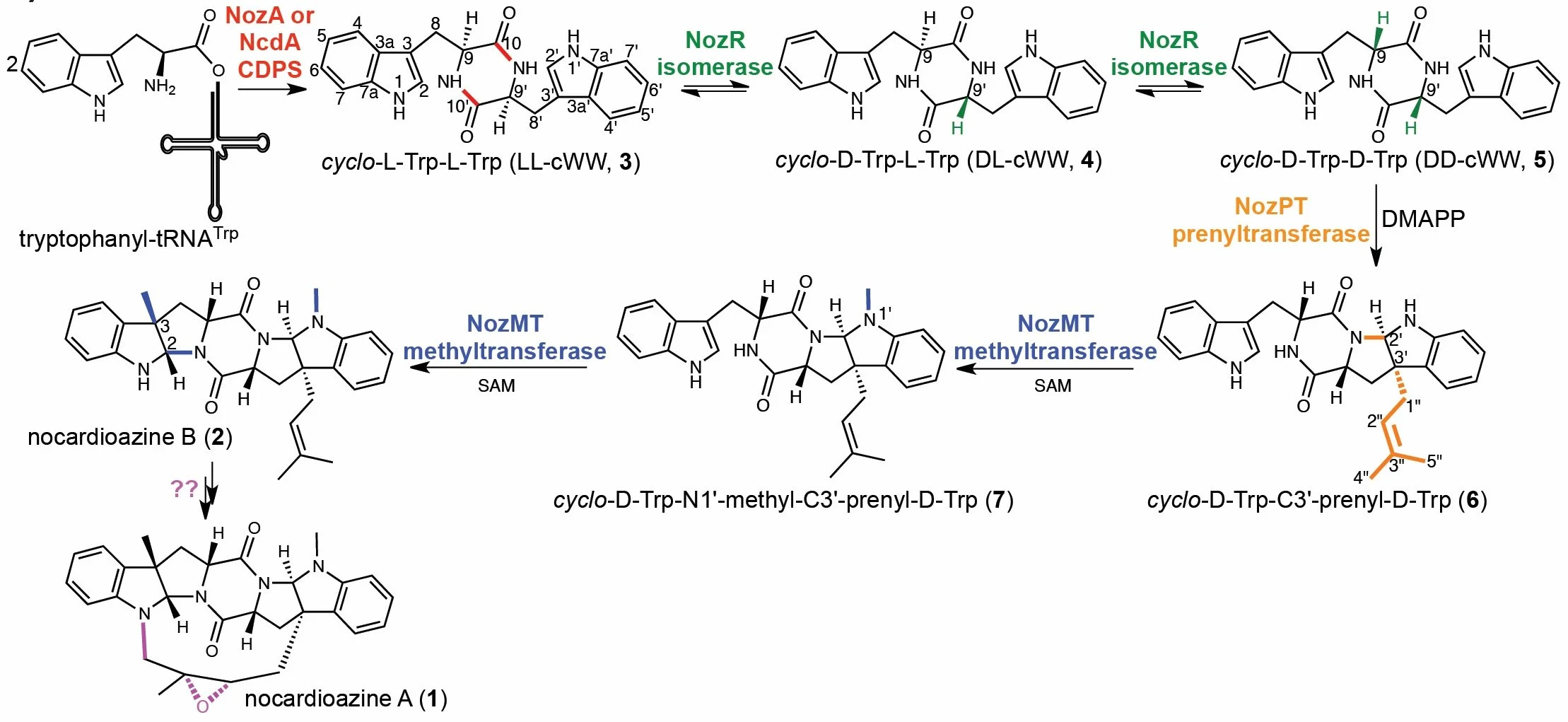 Abstract: The 2,5-diketopiperazines are a prominent class of bioactive molecules. The nocardioazines are actinomycete natural products that feature a pyrroloindoline diketopiperazine scaffold composed of two D-tryptophan residues functionalized by N- and C-methylation, prenylation, and diannulation. Here we identify and characterize the nocardioazine B biosynthetic pathway from marineNocardiopsis sp. CMB-M0232 by using heterologous biotransformations, in vitro biochemical assays, and macromolecular modeling. Assembly of the cyclo-L-Trp-L-Trp diketopiperazine precursor is catalyzed by a cyclodipeptide synthase. A separate genomic locus encodes tailoring of this precursor and includes an aspartate/glutamate racemase homolog as an unusual D/Lisomerase acting upon diketopiperazine substrates, a phytoene synthase-like prenyltransferase as the catalyst of indole alkaloid diketopiperazine prenylation, and a rare dual function methyltransferase as the catalyst of both N- and C-methylation as the final steps of nocardioazine B biosynthesis. The biosynthetic paradigms revealed herein showcase Nature’s molecular ingenuity and lay the foundation for diketopiperazine diversification via biocatalytic approaches.